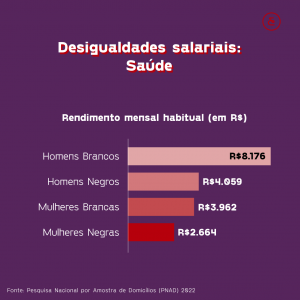 Essa diferença de salários é ainda mais preocupante quando avaliamos a partir da interseccionalidade de gênero e raça. O rendimento mensal médio de um homem branco na saúde é de R$8.176,00. Enquanto as mulheres brancas têm um rendimento médio de R$3.962,00, as mulheres negras são ainda mais desfavorecidas, com um rendimento médio de R$2.664,00. Ou seja, os homens brancos recebem aproximadamente duas vezes mais, em comparação às mulheres brancas, e quatro vezes mais que as mulheres negras na mesma área de atuação.